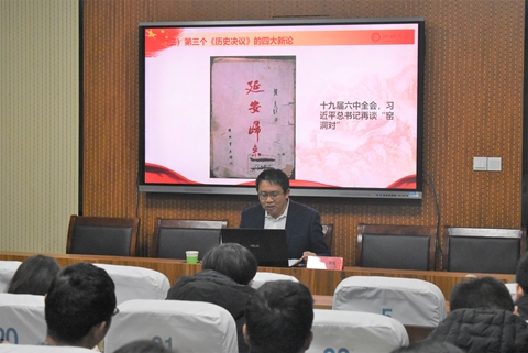为深入学习宣传贯彻党的十九届六中全会精神,2022年1月6日,ok138cn太阳集团529邀请ok138cn太阳集团党史学习教育宣讲团成员、马克思主义学院副教授黄昊做了题为《中国共产党三个历史决议的历史使命及重要意义》的专题宣讲,学院全体教师参加此次宣讲会。