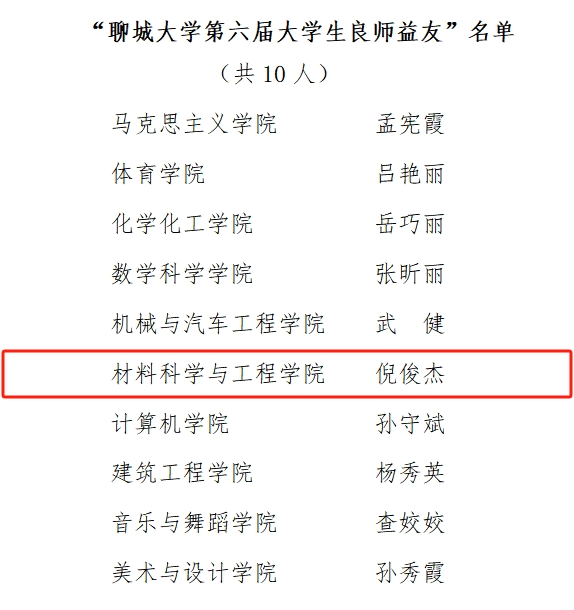 近日,ok138cn太阳集团完成第六届“大学生良师益友”评选工作,材料科学学院高度重视、积极落实,经多层评选,我院倪俊杰教授当选。
