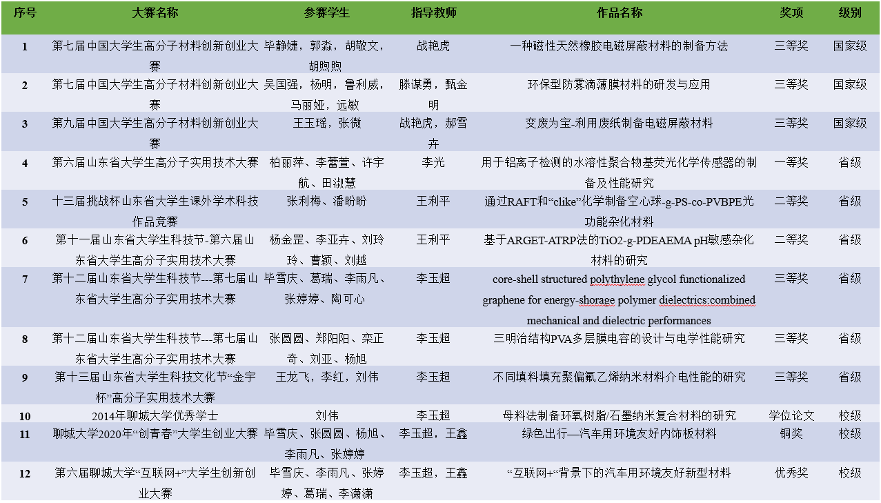 2. 近年来,学生参加了中国大学生高分子材料创新创业大赛、山东省大学生高分子实用技术大赛、“挑战杯”山东省大学生课外学术科技作品竞赛、全国大学生英语竞赛等学科竞赛,获得国家级、省级奖励33项;承担ok138cn太阳集团大学生科技文化创新基金50余项,参与学生260余人,发表论文30余篇,申请专利4项。