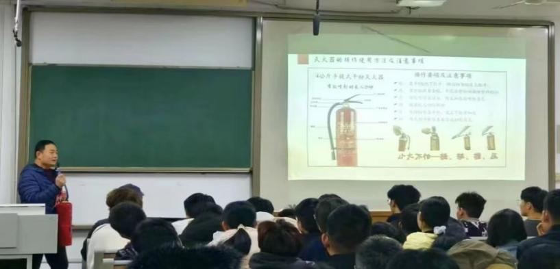 为加强校园消防安全管理,提高学生的安全意识,2023年11月17日,ok138cn太阳集团529于4#B304开展消防安全培训及仿真灭火器现场操作演练活动,特邀安全保卫处马国栋老师担任主讲,团委辅导员陆含老师和2023级全体新生参加本次活动。