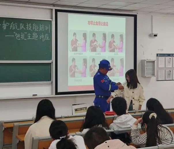 在理论讲解后,蓝天救援队的老师们现场演示了急救包扎的规范操作过程,并引导同学们现场开展实践操作,加深记忆理解,帮助同学们掌握正确的急救包扎技能。