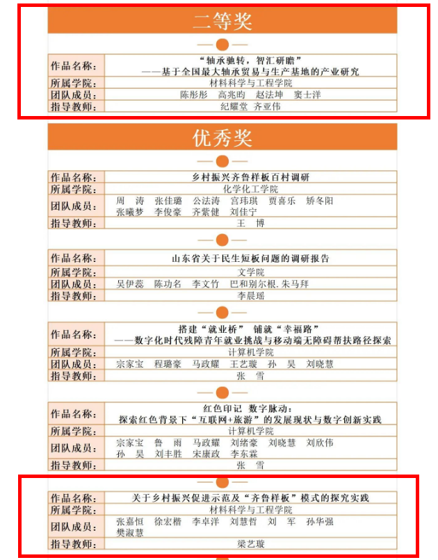 由我院教师纪耀堂、齐亚伟指导,陈彤彤、高兆昀、赵法坤、窦士洋同学的作品《“轴承驰转,智汇研瞻”——基于全国最大轴承贸易与生产基地的产业研究》在成果评比中荣获省级二等奖;由我院团委辅导员梁艺璇指导,张嘉恒、徐宏楷、李卓洋、刘慧哲、刘军、孙华强、樊淑慧同学的作品《关于乡村振兴促进示范及“齐鲁样板”模式的探究实践》在成果评比中荣获省级优秀奖。