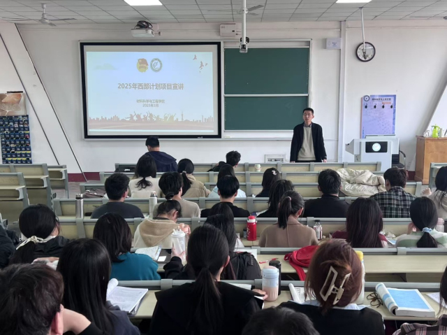 2025年3月11日,我院举办2025年西部计划宣讲会,金属材料工程专业69名学生参加。 齐老师简要介绍了西部计划服务的8个专项内容,详细解读了国家对西部计划项目的政策支持、生活保障等,帮助同学们了解西部计划的有关政策。宣讲会结束后,齐老师与同学们进行了交流,解答同学们的疑惑。