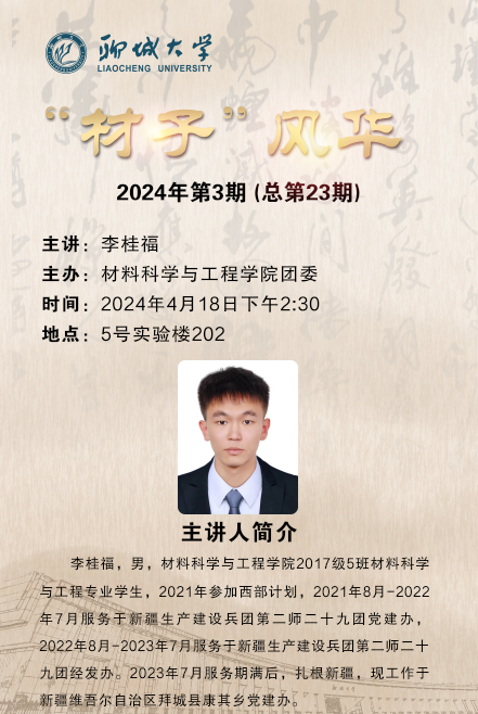 为进一步做好大学生志愿服务西部计划工作,弘扬志愿精神,引导和动员青年学生到西部去、到基层去、到祖国和人民需要的地方建功立业,2024年4月18日,ok138cn太阳集团529在5号实验楼202线上开展西部计划专题分享会暨2024年“材子”风华第3期活动,邀请2021届西部计划志愿者李桂福作西部计划专题分享。