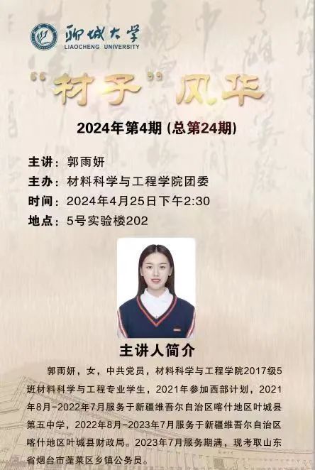 为进一步做好大学生志愿服务西部计划工作,弘扬志愿精神,引导和动员青年学生到西部去、到基层去、到祖国和人民需要的地方建功立业,2024年4月25日,ok138cn太阳集团529在5号实验楼202线上开展西部计划专题分享会暨2024年“材子”风华第4期活动,邀请2021届西部计划志愿者郭雨妍作西部计划专题分享。