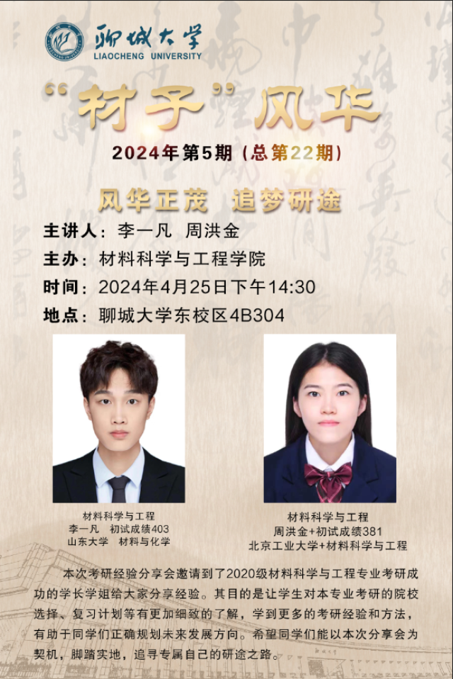 为进一步增强学生对考研的认识和了解,明确考研规划,挖掘自身潜能,营造良好的考研氛围,2024年4月25日,我院于4#B304开展材料科学与工程专业考研经验分享会,特邀2020级优秀考研学生李一凡、周洪金担任主讲。