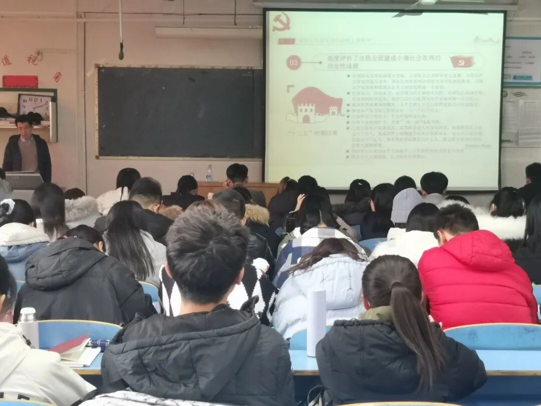 齐老师深入阐释了习近平总书记在党的十九届五中全会上的重要讲话精神,从深刻认识我国进入新发展阶段的重大意义、有利条件和重要特征,准确把握2035年远景目标和“十四五”时期我国发展的指导方针、主要目标、重点任务,牢牢把握构建新发展理念和新发展格局的战略构想和重要着力点,坚持党的全面领导、动员各方面力量为实现“十四五”规划和2035年远景目标而团结奋斗等四个方面,对《中共中央关于制定国民经济和社会发展第十四个五年规划和二〇三五年远景目标的建议》进行了全面宣讲和深入解读。齐老师表示,实现“十四五”规划和2035年远景目标,意义重大,任务艰巨,前景光明。他希望同学们能够将学到的理论应用到实践中去,同时又可以从实践中获得真知,脚踏实地,成为新时代合格的接班人。