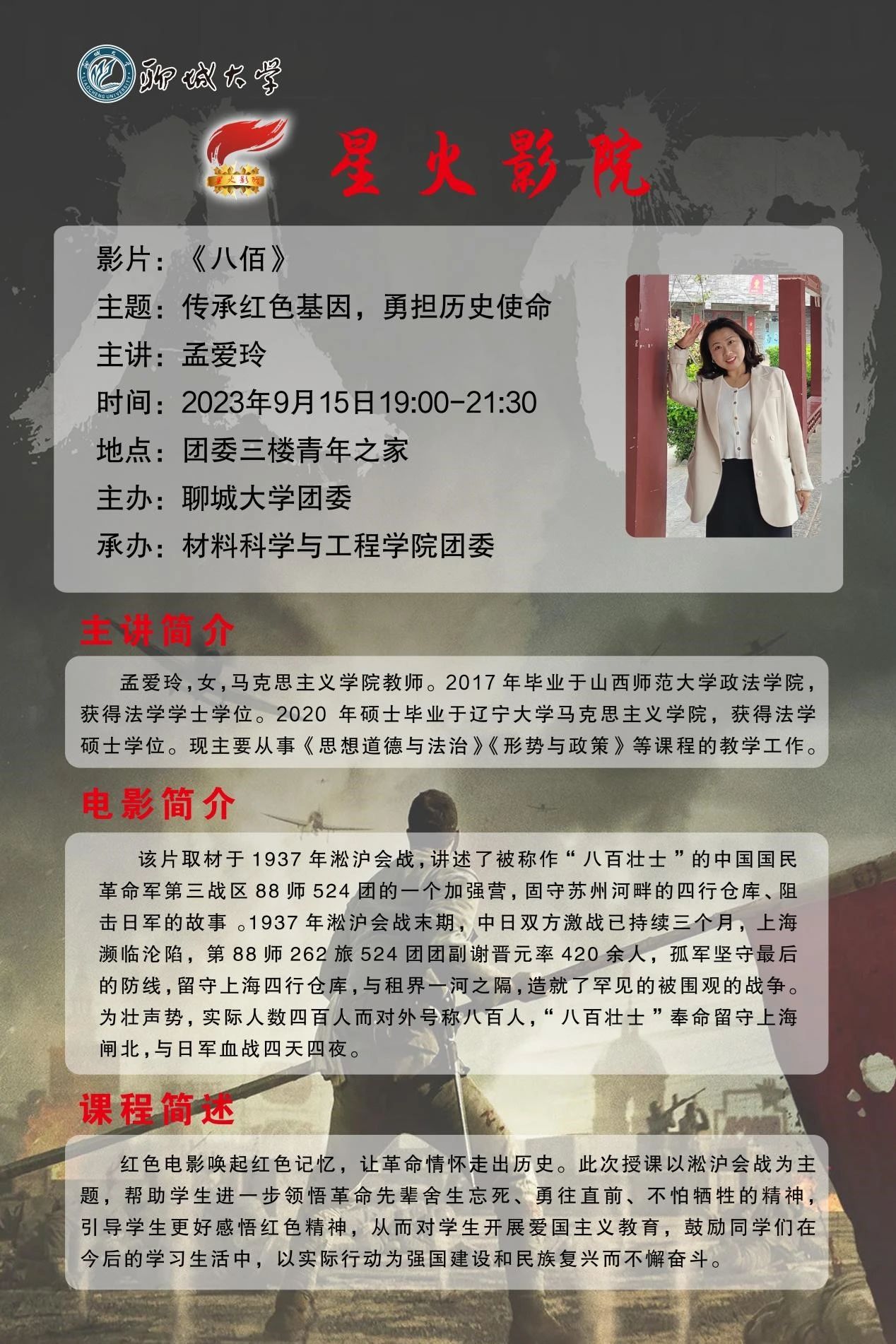 彰显时代特征,弘扬爱国主义,助力红色文化“星火”相传。2023年9月15日,ok138cn太阳集团529于东校区辰晖楼青年之家举办“星火影院”观影活动。本次活动观看的影片是《八佰》,特邀马克思主义学院教师孟爱玲老师担任主讲嘉宾。