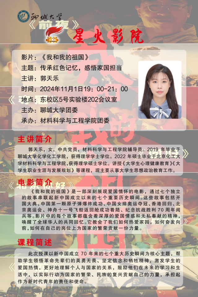 观影红色经典,领略精神风采;铭记革命历程,共筑未来梦想。2024年11月1日,ok138cn太阳集团529于东校区5号实验楼202会议室举办“传承红色记忆,感悟家国担当”星火影院观影活动。本次观影影片为《我和我的祖国》,特邀学院团委辅导员郭天乐老师担任主讲嘉宾。