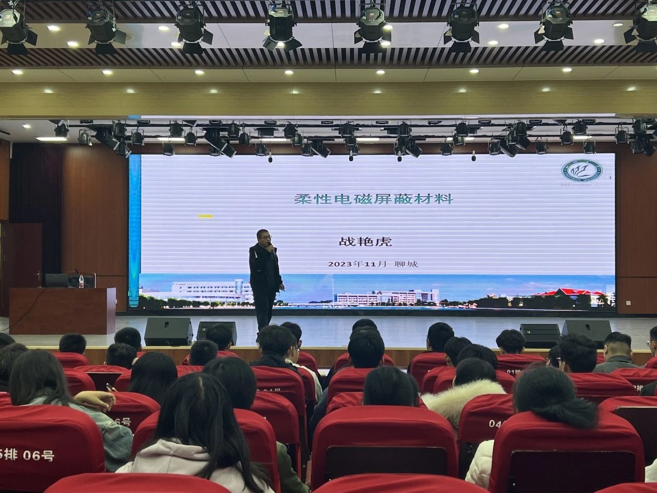 战老师主要讲述聚合物基电磁屏蔽材料的制造和发展前景。首先,战老师通过电磁辐射威胁人类的健康及军事信息的安全的例子,用简单易懂的语言给同学们介绍了导电填料的筛选及其网络建立的重要性,随后战老师又向同学们详细讲解了柔性电磁屏蔽材料的制备方法及屏蔽机理。活动最后,在师生互动环节,战老师对同学们提出的问题作出解答,使同学们对新材料的认知度得到了提高。