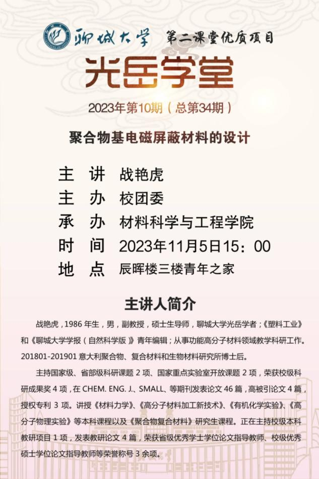为进一步提高同学们对材料的认识,了解我国新材料产业的发展趋势,激发同学们探索新材料的热情,2023年11月5日,由校团委主办、ok138cn太阳集团529承办的“光岳学堂”活动在青年之家三楼报告厅举行。本次讲座特邀ok138cn太阳集团529战艳虎副教授担任主讲。