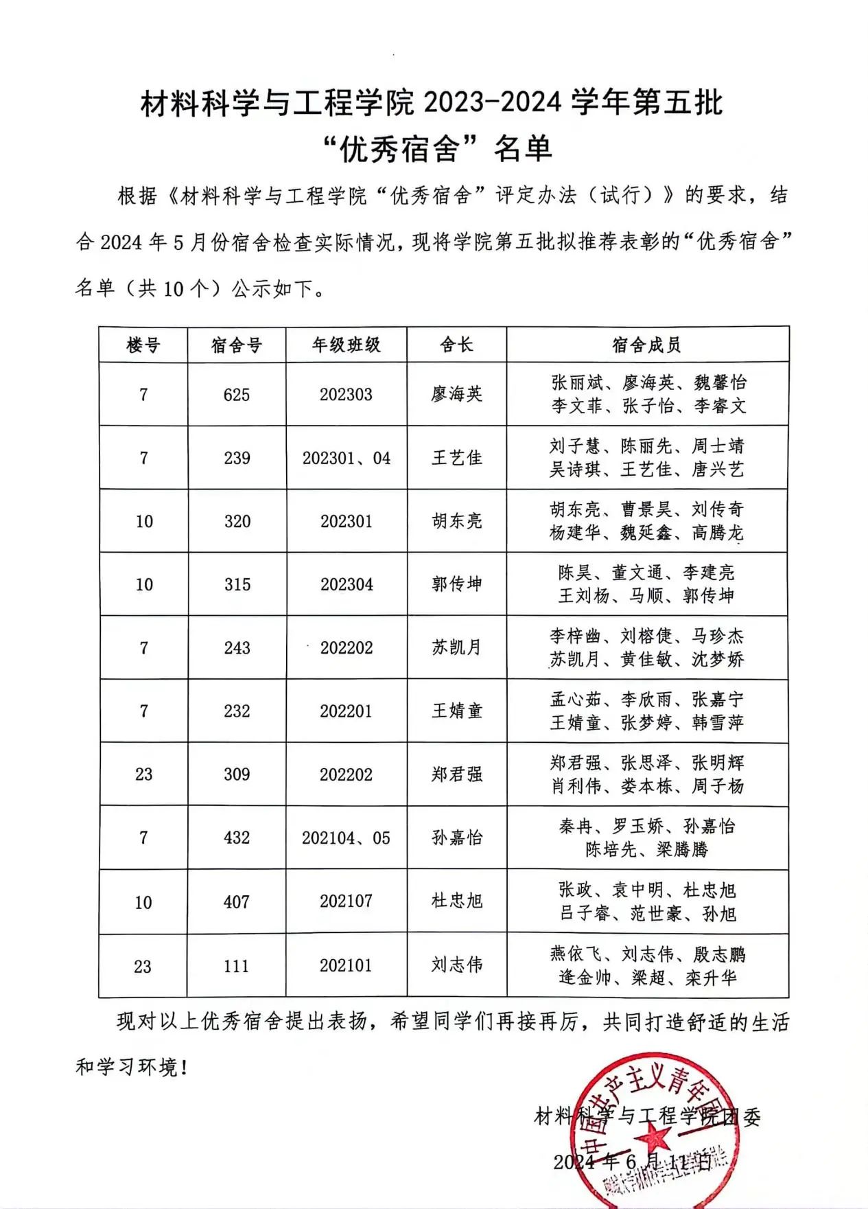 本次“优秀宿舍”评选活动是根据《ok138cn太阳集团529“优秀宿舍”评定办法》的相关要求,结合学院2024年5月份宿舍检查的实际情况,通过每周对学院全体宿舍的安全、卫生等进行严格的检查,并量化打分,确保整个评选过程公平公正。最后评选出第五批“优秀宿舍”共10间,分别是7#625、10#320、7#239、7#243、7#232、23#309、10#315、7#432、10#407、23#111宿舍。学院为以上“优秀宿舍”颁发了流动红旗、发放了宿舍用品奖励,并为宿舍成员在综合测评中予以适当加分。