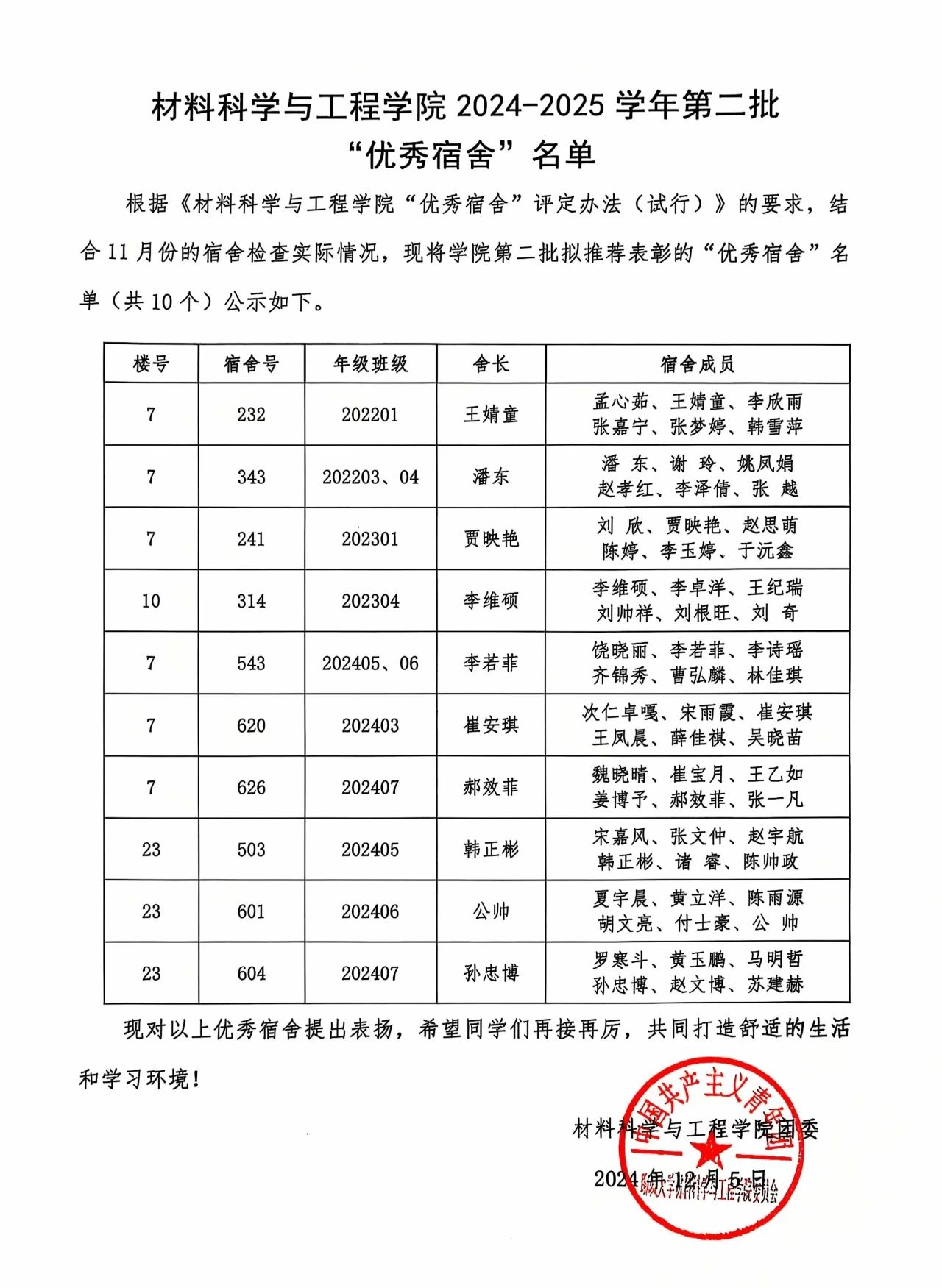 本次“优秀宿舍”评选活动是根据《ok138cn太阳集团529“优秀宿舍”评定办法》的相关要求,结合学院2024年11月份宿舍检查的实际情况,通过每周对学院全体宿舍的安全、卫生等进行严格的检查,并量化打分,确保整个评选过程公平公正。最后评选出本学年第二批“优秀宿舍”共10间,分别是7#232、7#343、7#241、10#314、7#543、7#620、7#626、23#503、23#601、23#604宿舍。学院为以上“优秀宿舍”颁发了流动红旗、发放了宿舍用品奖励,并为宿舍成员在综合测评中予以适当加分。