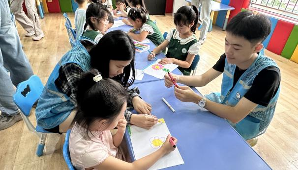 活动收官环节,实践团队组织孩子们开展“专属心情花创作”活动。孩子们手持画笔,在画布上自由创作,用丰富的色彩、独特的造型勾勒出属于自己的“心情花”——每一朵“心情花”都承载着孩子们当下的情绪状态,既是他们内心世界的直观呈现,也是情绪得到释放与疏导的生动见证。实践团队成员在现场耐心陪伴,鼓励孩子们分享创作理念,进一步强化孩子们对情绪的认知与表达能力。