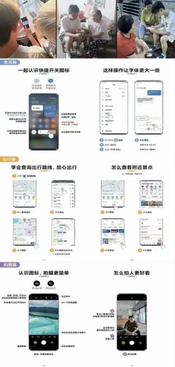 针对老年人群体在学习新技术时存在的记忆能力较弱、操作上手难度大等特点,服务团成员精心筹备,编制了一套图文并茂、通俗易懂的“智能手机实用功能图解手册”。手册系统涵盖了老年人日常高频使用的功能,如地图导航、拍照录像、视频通话等,并通过清晰的步骤拆解与直观的图示说明,降低学习门槛。实践过程中,志愿者们采用“一对一”“手把手”的教学模式,耐心解答老人们的疑问,从解锁屏幕、添加联系人等基础操作,到微信支付、线上挂号等进阶功能,逐环节进行细致指导,帮助老年人逐步掌握使用技巧。