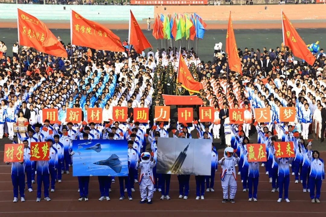 “材子逐梦,赢在未来。用新材料助力中国航天梦。”我院师生身着统一服装,手中挥舞着国旗,高喊着口号,迈着坚定的步伐走向主席台,他们团结一致,展现着学院的精神风貌。相信在新时期新时代,材料学院全体师生将齐心协力,紧跟时代发展步伐,为国家新能源新材料高速发展不断添砖加瓦。