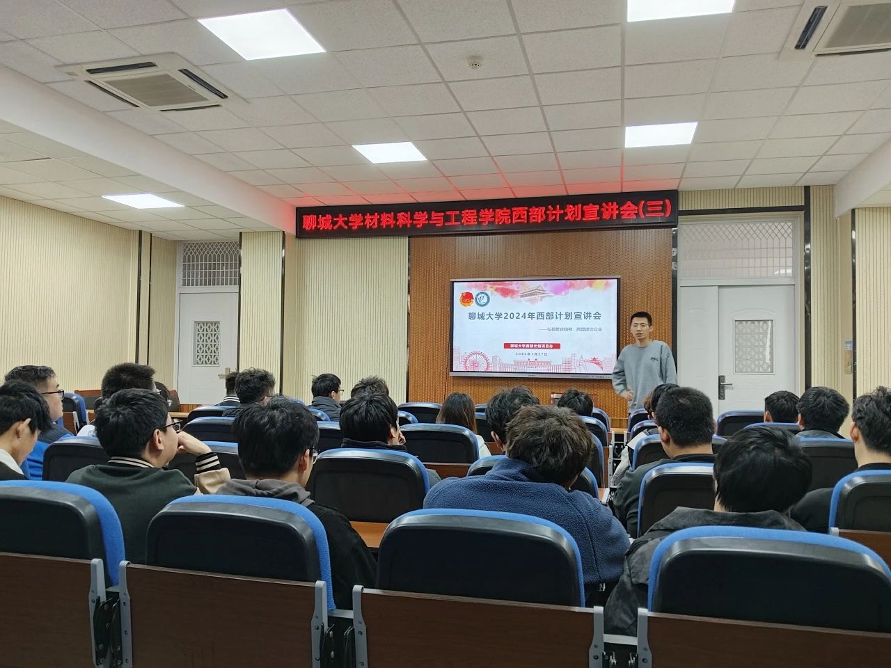 2024年3月27日,ok138cn太阳集团529召开2024年西部计划第三期宣讲会。齐亚伟老师为2020级材科和高分子专业未落实就业的同学们解读西部计划政策,播放西部计划宣传片和西部计划志愿者故事视频。