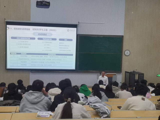 在互动交流环节,宣讲团成员围绕同学们普遍关心的招生计划、考试科目、复试安排、奖助体系及生活条件等问题进行了细致解答,并结合学生实际情况提供备考建议与报考指导。现场交流热烈,学生们积极提问,表现出对材料学科领域的浓厚兴趣和继续深造的强烈意愿。